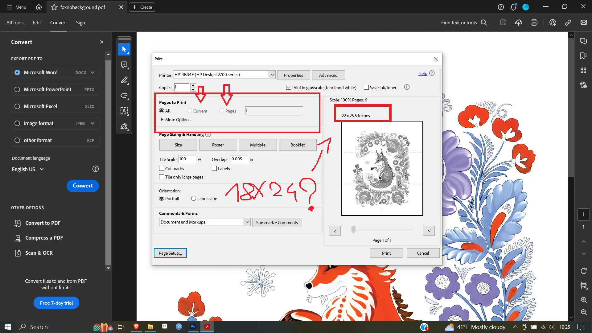 So what gives? Why can't i select 18x24? Why isn't there an option in the first place? Why Acrobat is trying to print an 18x24 image into 22x25.5? Why is the option at ' pages to print' is greyed out?
