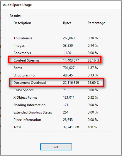 By conducting a space audit, you'll receive a comprehensive report detailing the bytes used by specific document elements like fonts, images, bookmarks, forms, named destinations, and comments. This report includes both byte values and the percentage of the total file size they represent.
