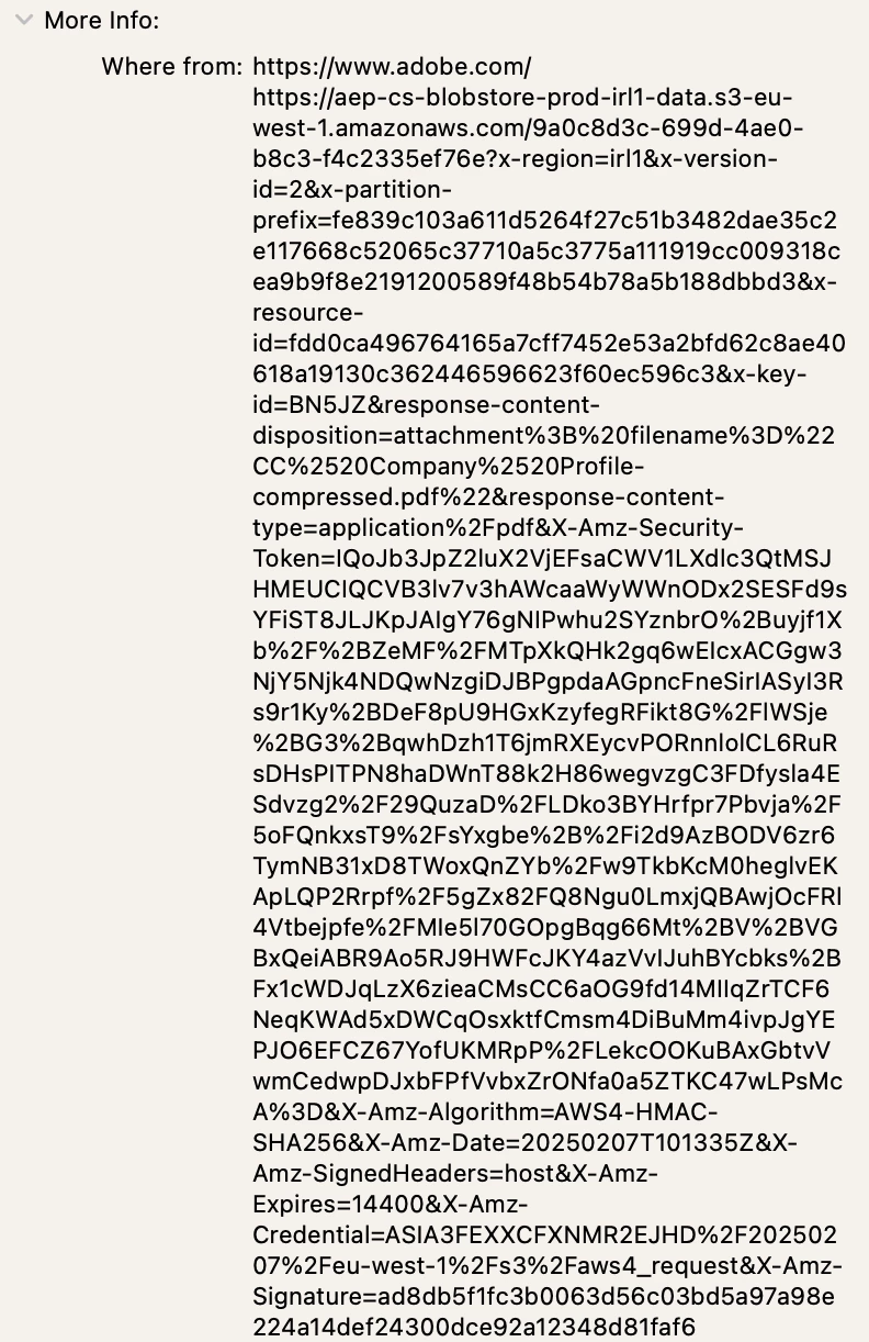 I have recently compressed a large PDF file and notice that in the 'properties' section under 'more info/where from' it has a really long link showing that the file has been compressed in Adobe. Is there any way to remove this as it is a massive eye sore. Screenshot attached.