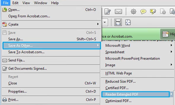 To save pdf as Reader extended, click File > Save as other > Reader extended PDF