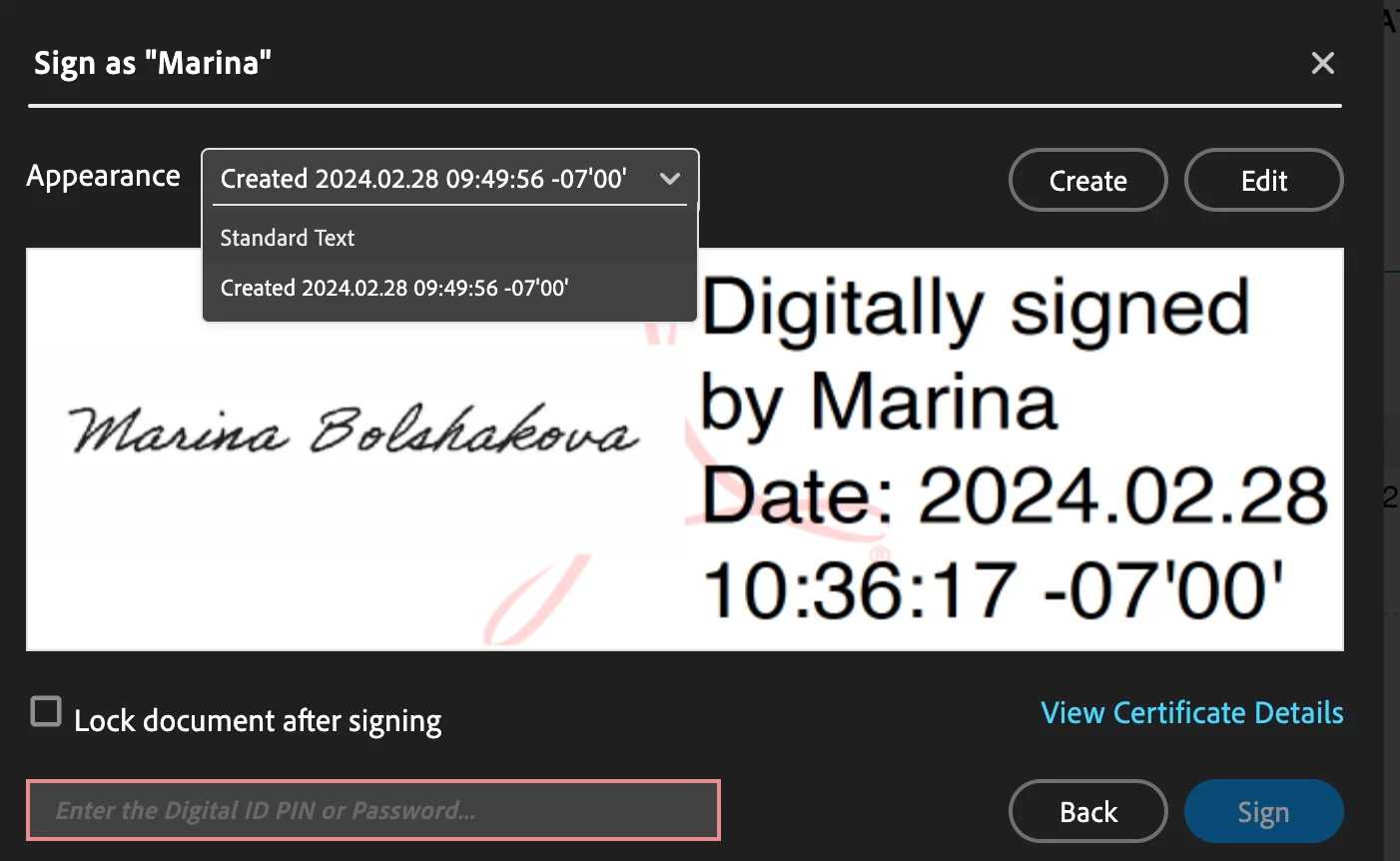 When I am opening the document that is sent by email (not from Acrobat pro) in PDF I can use this one. But, once it comes as a request from adobe acrobat it does not let me put a digital signature, just a regular one like this one below.