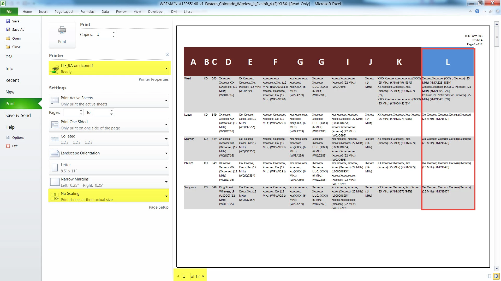 When I go to File > Print, it shows pages 1 – 12, Columns A - L