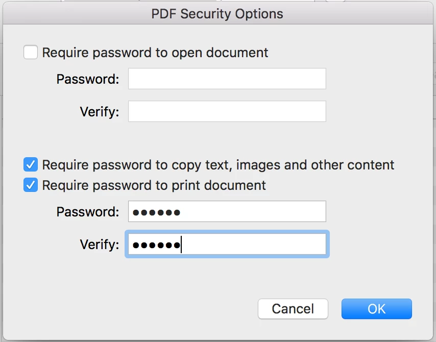 I want to add security options (figure 2) to a pdf to prevent copying, saving and printing but Adobe wont allow me to save these options while printing (figure 3). The issue is that you can't get to the security options feature without opening the print dialogue box (figure 1) which you also can't close without closing the security options feature. Its a vicious cycle haha.