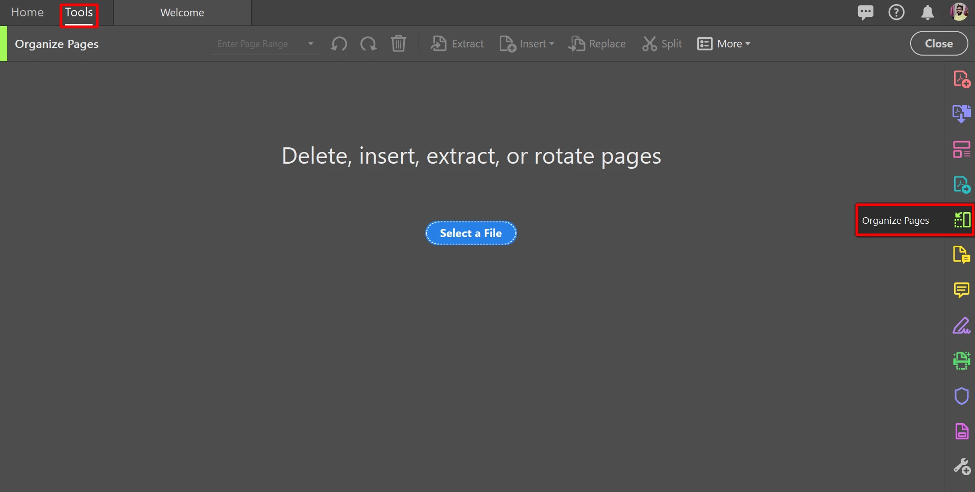 Open the Organize Pages tool using the shortcut in the right pane or from the Tools center, accessed at the top left.