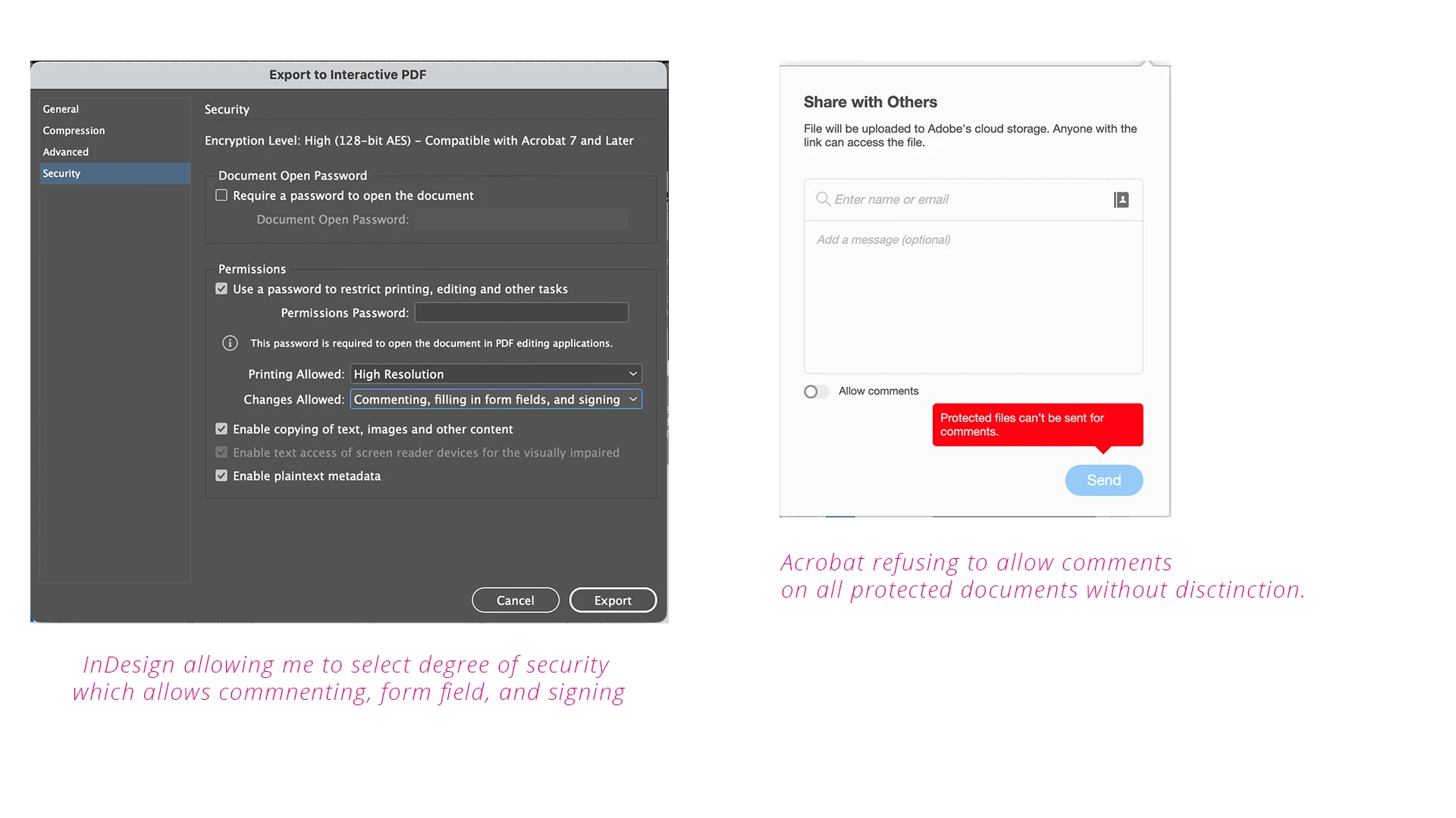 Hello! Since we had issue in the past with documents being revised outside of the working file, we have set in place a process for version control where we are adding a security password in InDesign while still allowing for comments, form filling and signing when we export in pdf. As I am trying to gather external comments for final approval and review, acrobat is not letting me select the allow comments because it is a secured document (without distinction that this one should not be locked for comments). I found an answer from 2018 (https://community.adobe.com/t5/acrobat-discussions/why-i-can-not-send-protected-file-for-review/m-p/10139264). Sending by email seems very backward to me as it means that it is no longer a live document where we can gather all comments at the same time together. Exporting the file without securing to allow comments is defeating the purpose of securing it in the first place as we want to make sure that people will not edit the file. Is there any other work around that would allow me to share a secure document AND gather comments on the same document too. (aside from asking people to put comments on document save and share again in a certain order...) Thank you!