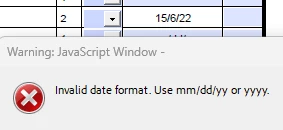 app.alert("Invalid date format. Use mm/dd/yy or yyyy.");