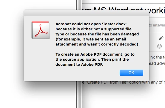 I also am unable to use the "Create PDF from File" option with any of my MS Word documents. It keeps giving me this error message (see image below). So my only option has been the "Save As PDF" option in MS Word, but then my hyperlinks don't work. Please fix this!!!!!