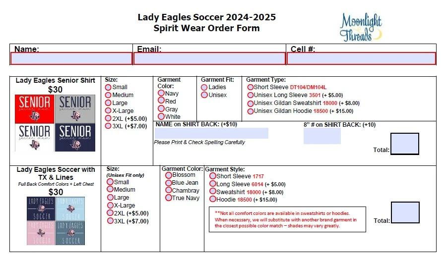 - Base Cost + Upcharges by selection choices (radio buttons and Personalization Text Fields): Extened sizes and premium garments etc. Each item will be unique. See attached order form.