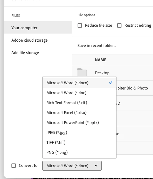- In the Save As dialog, choose Adobe PDF from the format options.