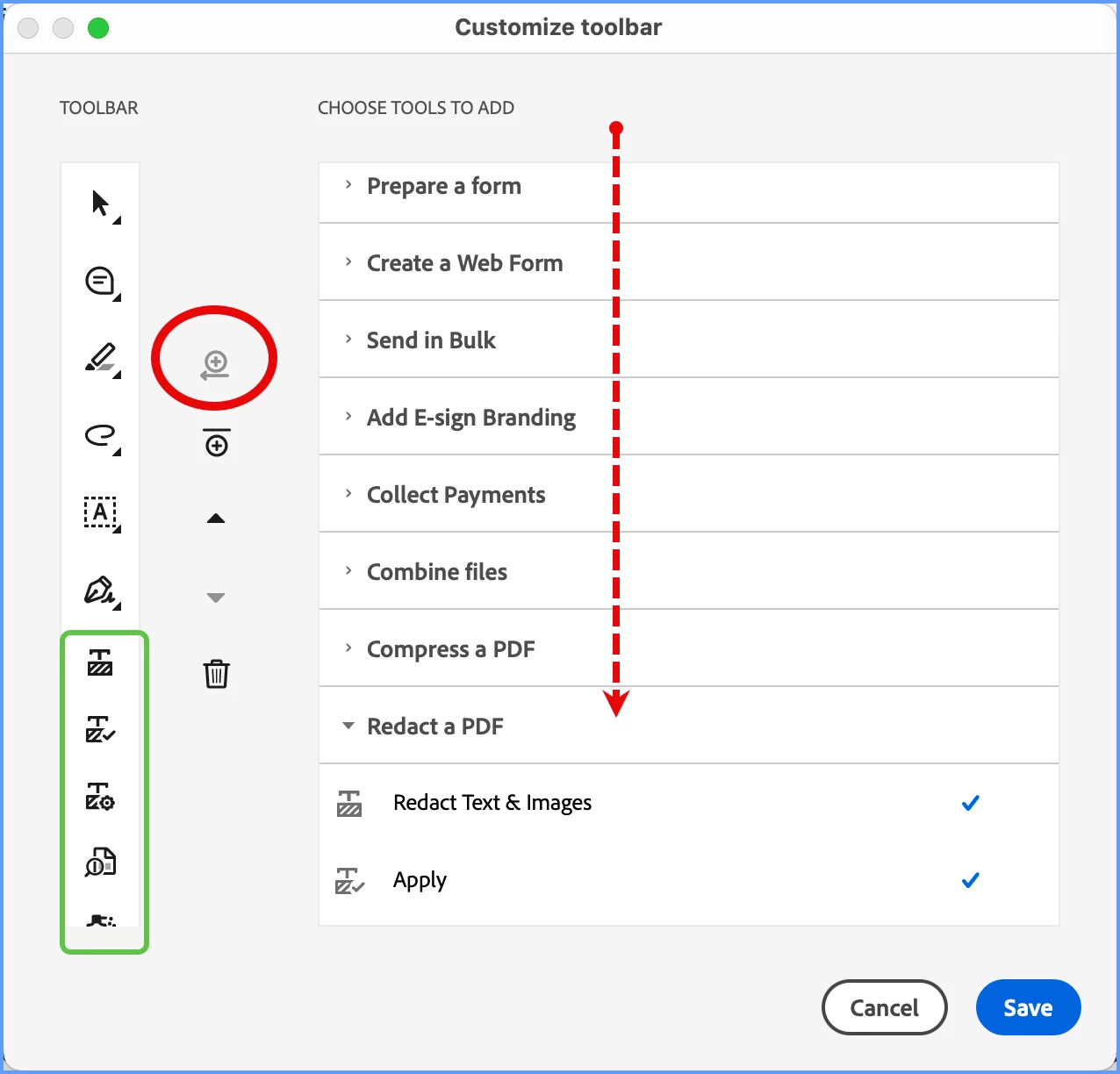 Now, if you Redact often, you may want to put this into the Floating Tool Bar. If so, on the bottom of the FTB, you’ll see an ellipse (…). Click on that and you can add this to the bottom of the list of custom FTB options. Scroll down the right-hand side until you come to the Redact options, and select all or a few (look for checkmarks) and then click on the top “move” button (circled in Red), and they will be added to your FTB list of tools.