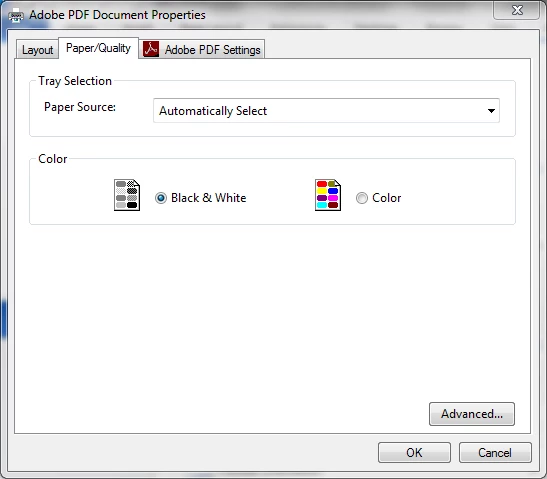 I'm unable to print grayscale when printing to the printer "Adobe PDF". The option to print in grayscale is grayed out. How do I turn that back on?