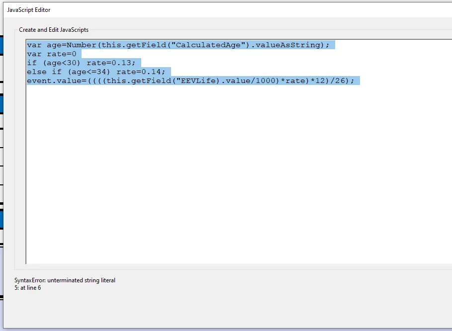 Ultimately, I need this field to get the age from "CalculatedAge", look in a table, pull the rate needed and put into the formula:  event.value=((((this.getField("EEVLife").value/1000)*Rate)*12)/26)
