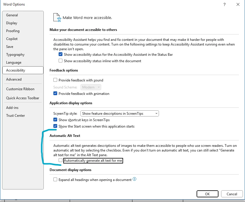 I have created a PDF (from MS Word) which contains text and images. The images were taken on my smartphone and inserted into Word. There are no tags or properties that have any 'layman's' description of the content of the images (either when standalone images or after insertion into Word), but once I have saved the Word document as a PDF and open it in Acrobat, if I hover over the images a pop-up shows with a brief generic description (it has detected some trees, so has added "A close-up of a tree - Description automatically generated") - I can't see where this is happening or how to stop it. Any help appreciated.