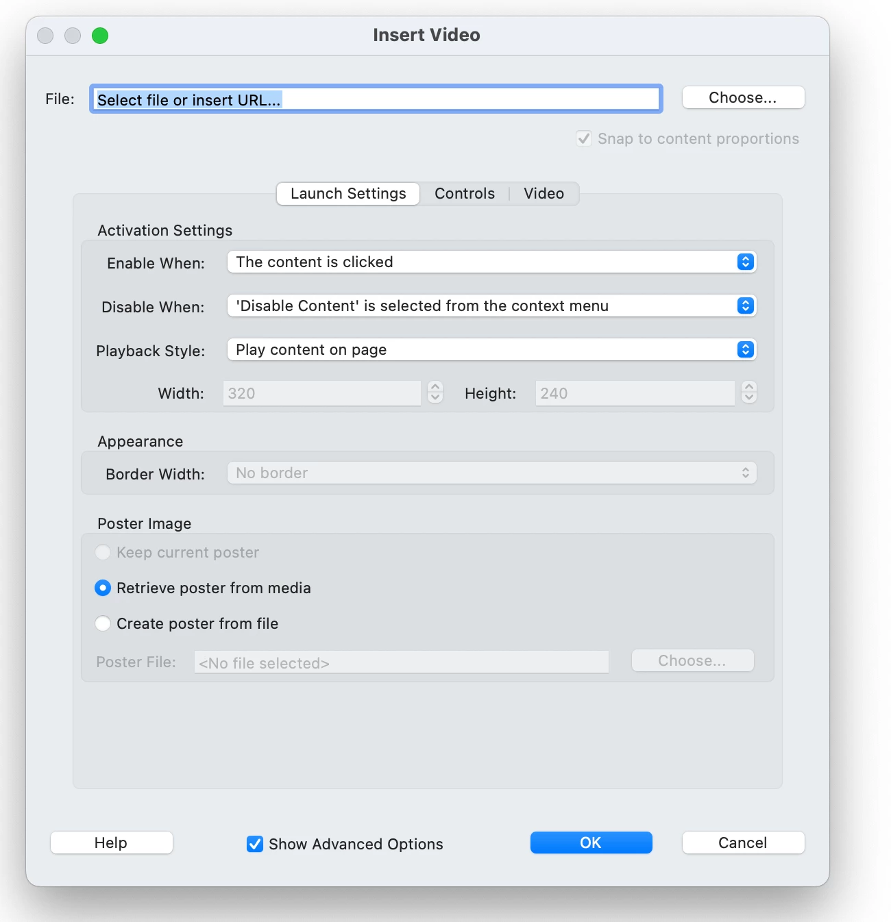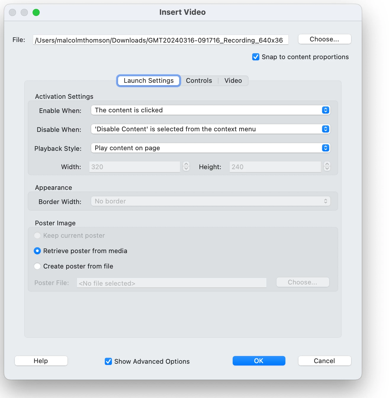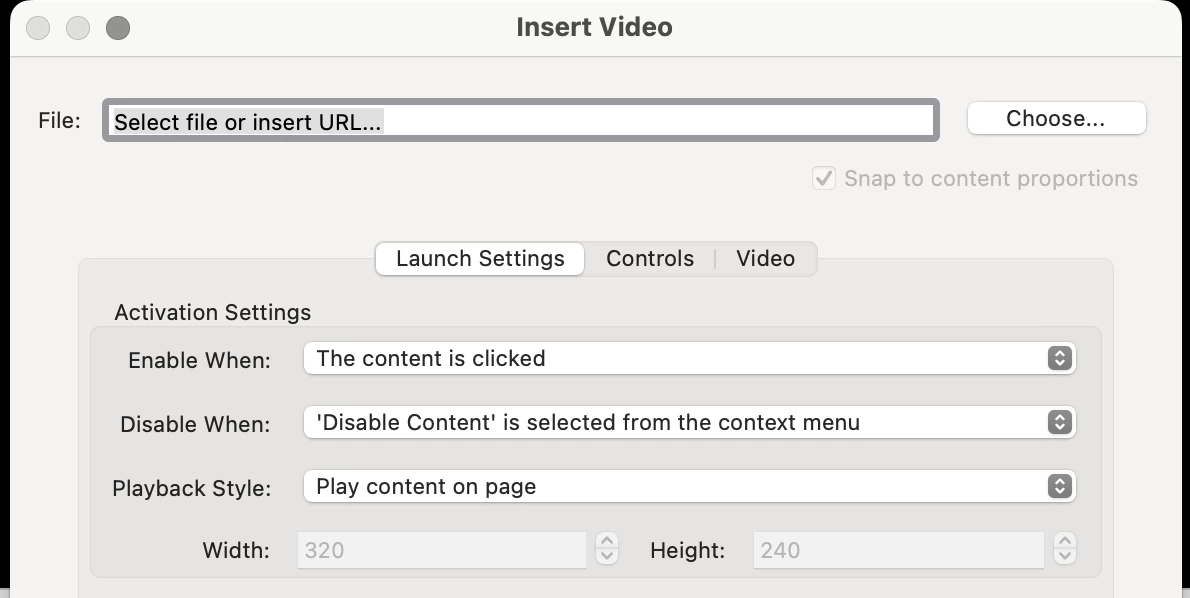 I am reviving a previous thread. When placin 16:9 video into my PDF, it gets placed in a different ratio with black bars above and below. When looking at the settings during placement, the "Snap to content proportions" is checked and grayed out. The width and height are also grayed out at 320x240. I am unable to chnage the dimentions or crop the video.