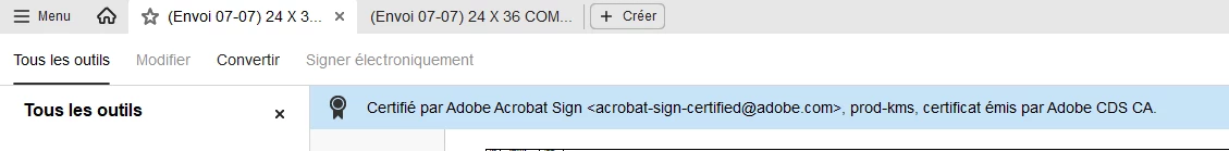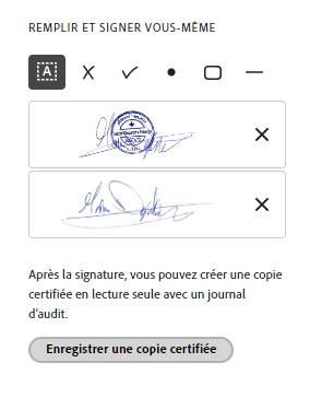 J'utilise le bouton ''enregistrer une copie certifiée'' lorsque je signe des documents (Ci-dessous). L'onglet ''signer électroniquement'' est pratique, car il me permet de signer plusieurs pages sur un même document facilement. Je souhaite continuer à utiliser cette méthode de signature.