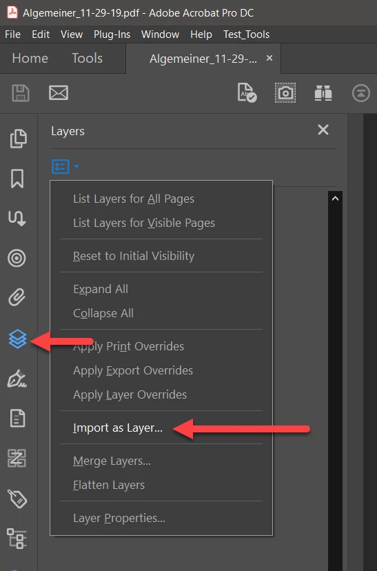 (3) Open the target PDF file (the one you wanted to insert PostScript or PDF into). Open the Layers palette from the left side options. Then select the Import as Layer… option.