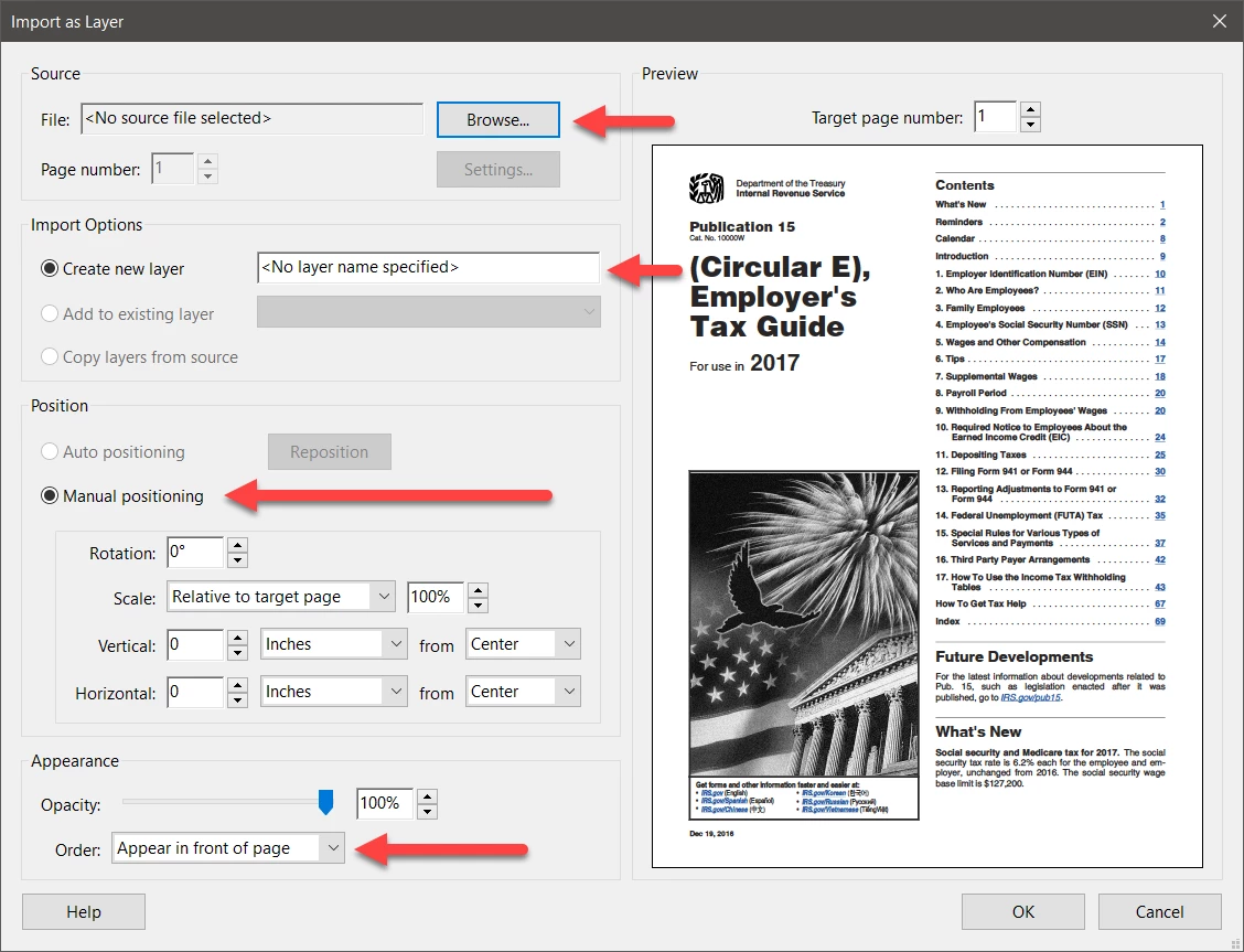 (4) You then are presented with a dialog that lets you choose the PDF file to include, the new layer name, and numerous options for sizing and positioning the PDF file you are importing. After completing this step, press OK. You can then optionally merge layers.