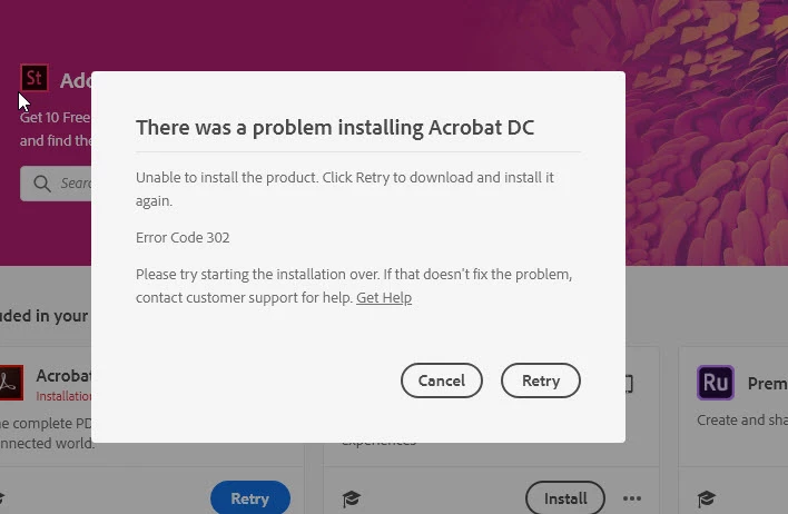I need assistance troubleshooting errors while attempting to install Acrobat DC
