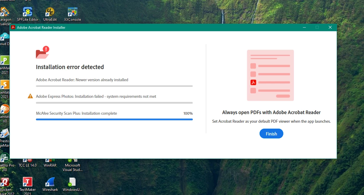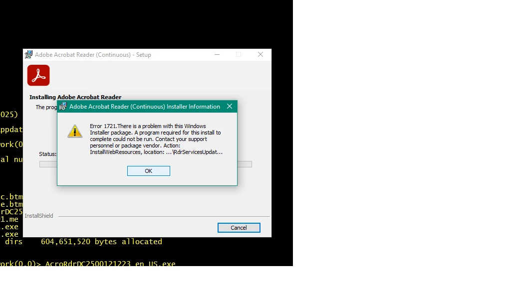 I run the 32 bit installer (Reader_en_install) and I get a message that adobe is alread installed --- but it is not in ends in these 2 screens