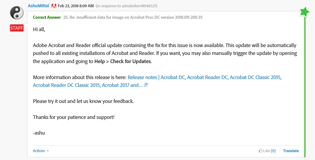 - Below, from a previous forum discussion in February 2018, it was stated the fix was available, however, it has not seemed to fix the software on our end.