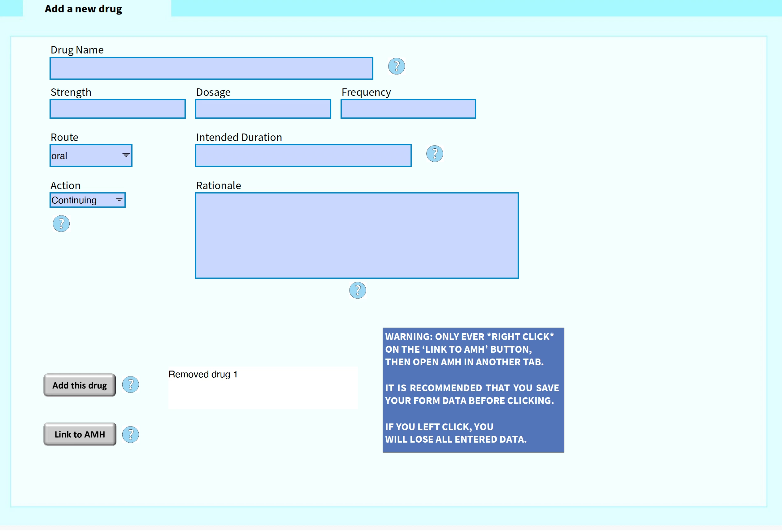 • The Add a New Drug tab allows you to add drugs to your drug list. You can enter the relevant Drug