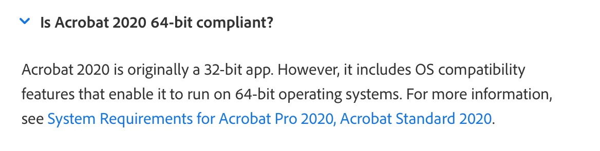 I have to say that, despite the statement "Is Acrobat 2020 64-bit compliant?