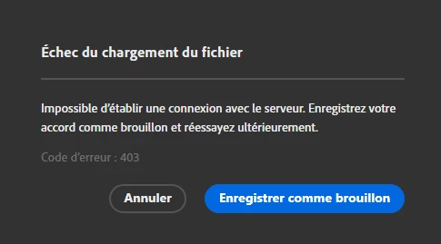 "Impossible d'établir une connexion avec le serveur, enregistrez votre accord comme brouillon et réessayez ultérieurement."