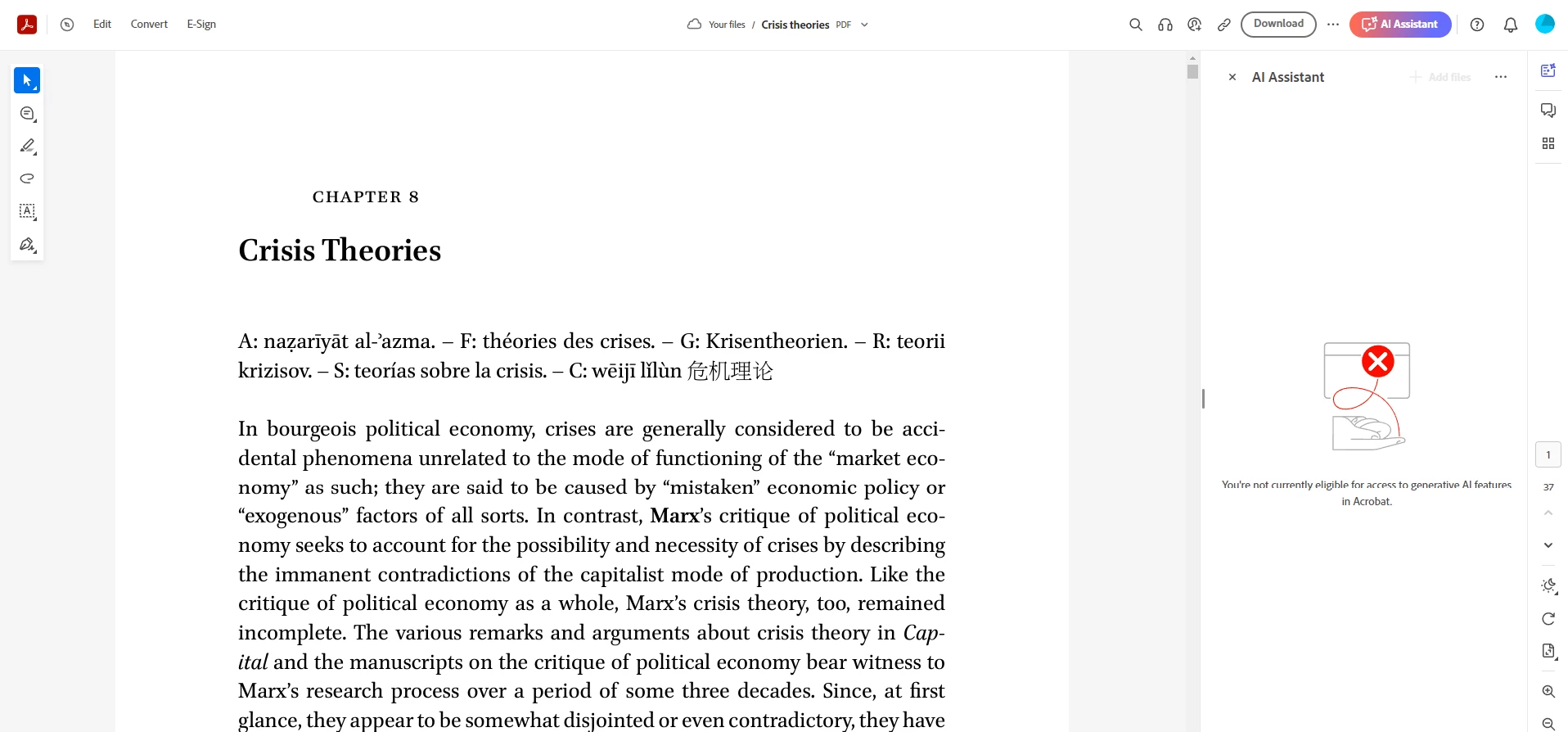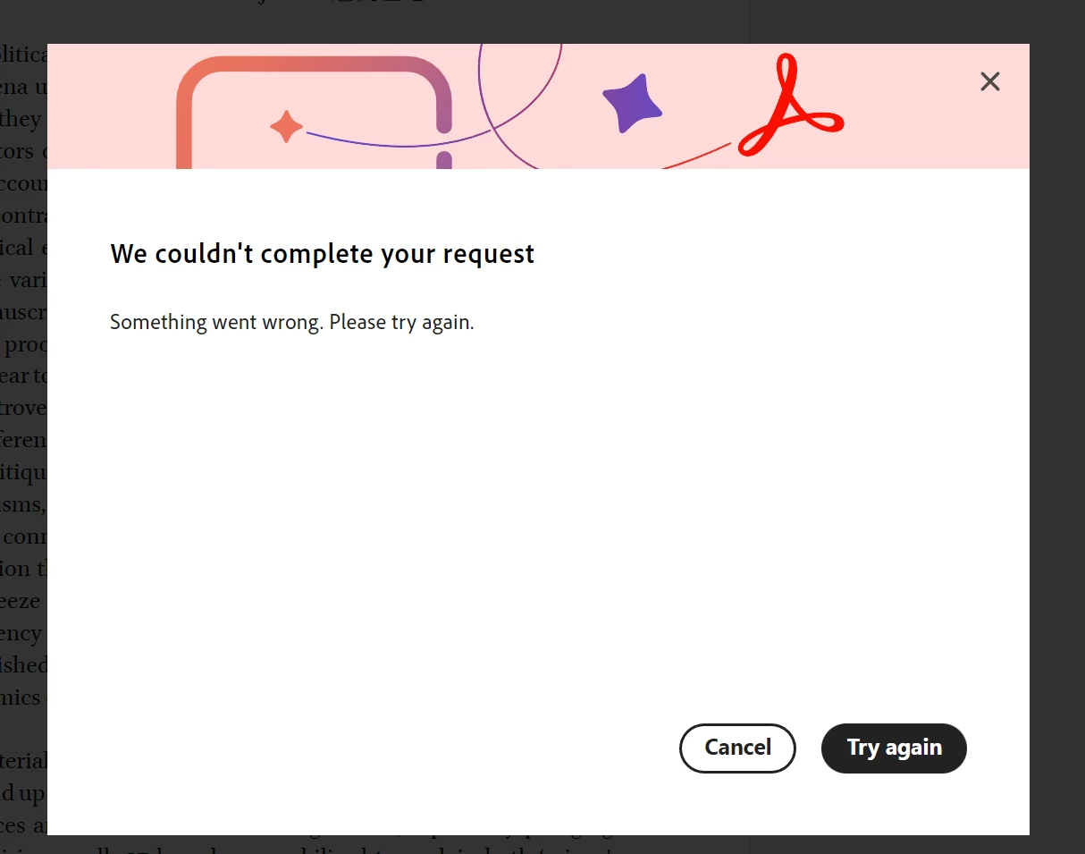 Hello, I am having issues using the generative AI feature. I have a pdf file that is freely available on the internet (see second photo). However, I am getting this error message: "You're not currently eligible for access to generative AI features in Acrobat", when using the web version of adobe acrobat. When I try to generate a summary using the deskop application I get this error message "We couldn't complete your request. Something went wrong. Please try again."