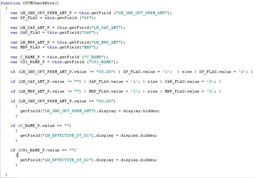 I'm using a product that pulls field data in from XML when processing PDF documents for a loan origination system. I have some code that I am trying to use to hide a particular field when our loan origination system passes the value "$0.00". I also have some code that I am trying to hide a date field next to a co-borrower 1 and co-borrower 2 fields.
