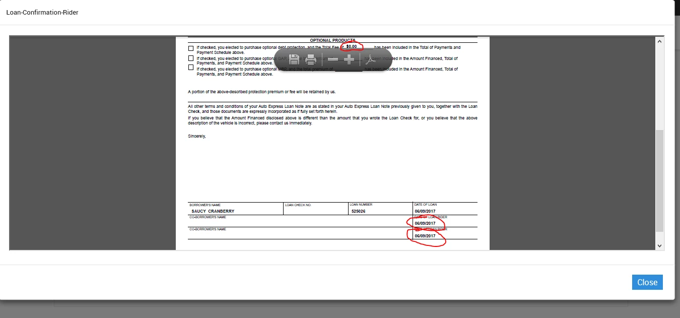 When processing the PDF's through our system they look correct on screen. If there isn't a co-borrower 1, there is not a date in the date field next to the name. Same deal with co-borrower 2 and its date field. When there is no loan insurance, the field is hidden. When there is loan insurance, the amount is in the proper field (example $917.17).