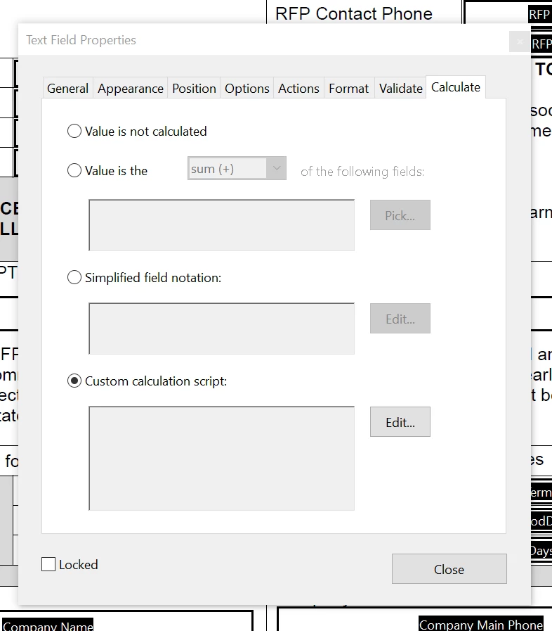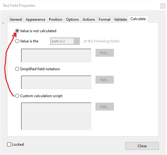 I am trying to use custom calculation script using javascript to populate a field on the PDF. I select "Custom calculation script", then press the "Edit" button, enter the code below into the editor, then click the "OK" button. The problem is that the code is never retained and the radio button is reset to "Value is not calculated" on the fields "Calculate" tab.