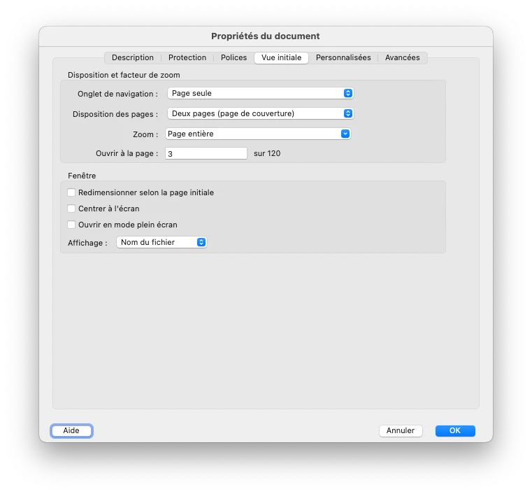 I can't find how to save initial vue document properties on macOS in Acrobat DC.