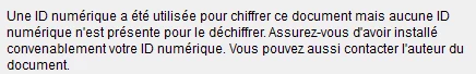 Je dois modifier un PDF que j'ai créé, mais je n'arrive pas à l'ouvrir. Un message qu'une ID numérique a été utilisée pour chiffrer, mais qu'uncune ID n'est présente pour le déchiffrer ...