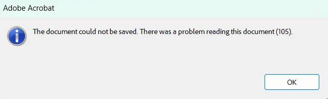 When I open a pdf using Adope on my desktop it will not save. I keep receiving error message 105. In addition I've updated the most recent patch but I'm still receiving this error message. I cannot digitally sign documents using military ID and I cannot save fillable PDFs anymore. This is a recent issue and I feel like I'm stuck. I don't know what happened but something messed up my Adobe PDF beyond repair.