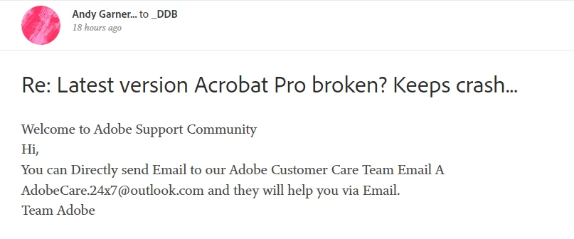 Gee, Adobe, clearly there's a problem. Quick roll-out of rollback procedures? Something? Pro indicated an update of some sort earlier today - fine - now crashes on ALL pdf files I open. I've rebooted. Same. I have work to do.