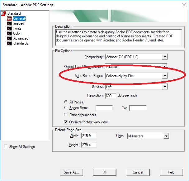I have set Win10 > Setting > Devices > Printer & scanners > Adobe PDF > Manage > Printing Preferences > Layout > Orientation
