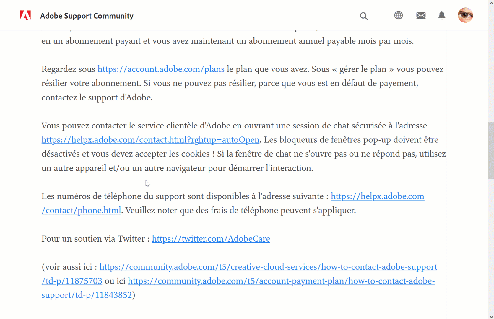 (voir aussi ici : https://community.adobe.com/t5/creative-cloud-services/how-to-contact-adobe-support/td-p/11875703 ou ici https://community.adobe.com/t5/account-payment-plan/how-to-contact-adobe-support/td-p/11843852)