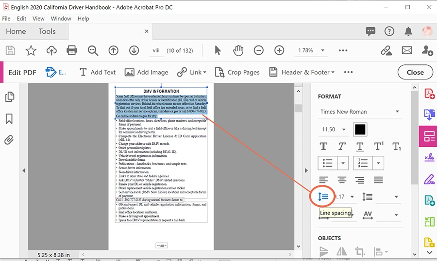 How do How can I find out what the spacing number is in between the lines in a paragraph in Acrobat Pro DC in windows?
