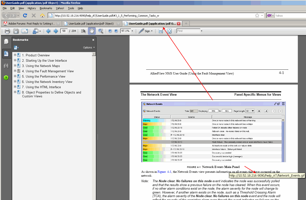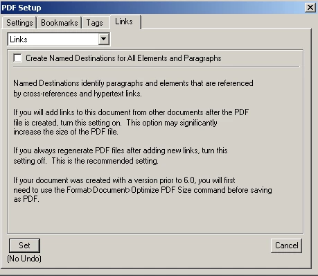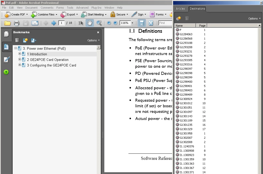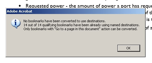 We're talking about make a large manual that consists of many PDF files arranged in a hierarchy. It begins with an HTML file where the user chooses a topic that takes them to a PDF file that serves as a table of contents. The user then chooses a specific topic. Here's the issue. The specific topic is NOT always the first page of the corresponding PDF. Named destinations are set correctly. If you open the TOC PDF in Adobe (and not the IE plugin of Adobe) the links work correctly to the appropriate destinations. If however, you follow the links from the original HTML file, it uses the Adobe plugin inside IE. The links to the destinations DO NOT work in this case - it only takes you to the first page of the PDF on the topic, NOT the specific destination within the document.
