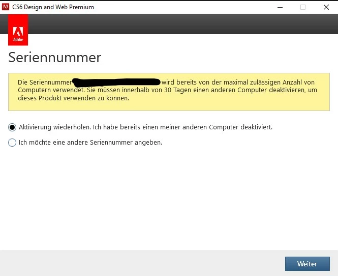 habe seit ein paar Tagen das Problem, dass meine Adobeprodukte nach einer Lizenz-Nummer verlangen und nach Eingabe wird geschrieben dass zu viele Geräte registriert sind. Habe aber auf dem gleichen Rechner bereits 5 Jahre gearbeitet ohne Probleme.