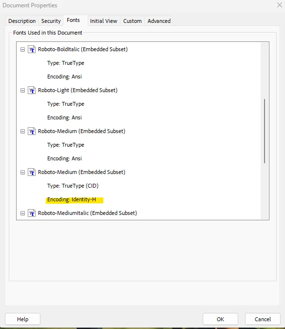 Locate instance of text using a specific font encoding within acrobat (h-encoding)