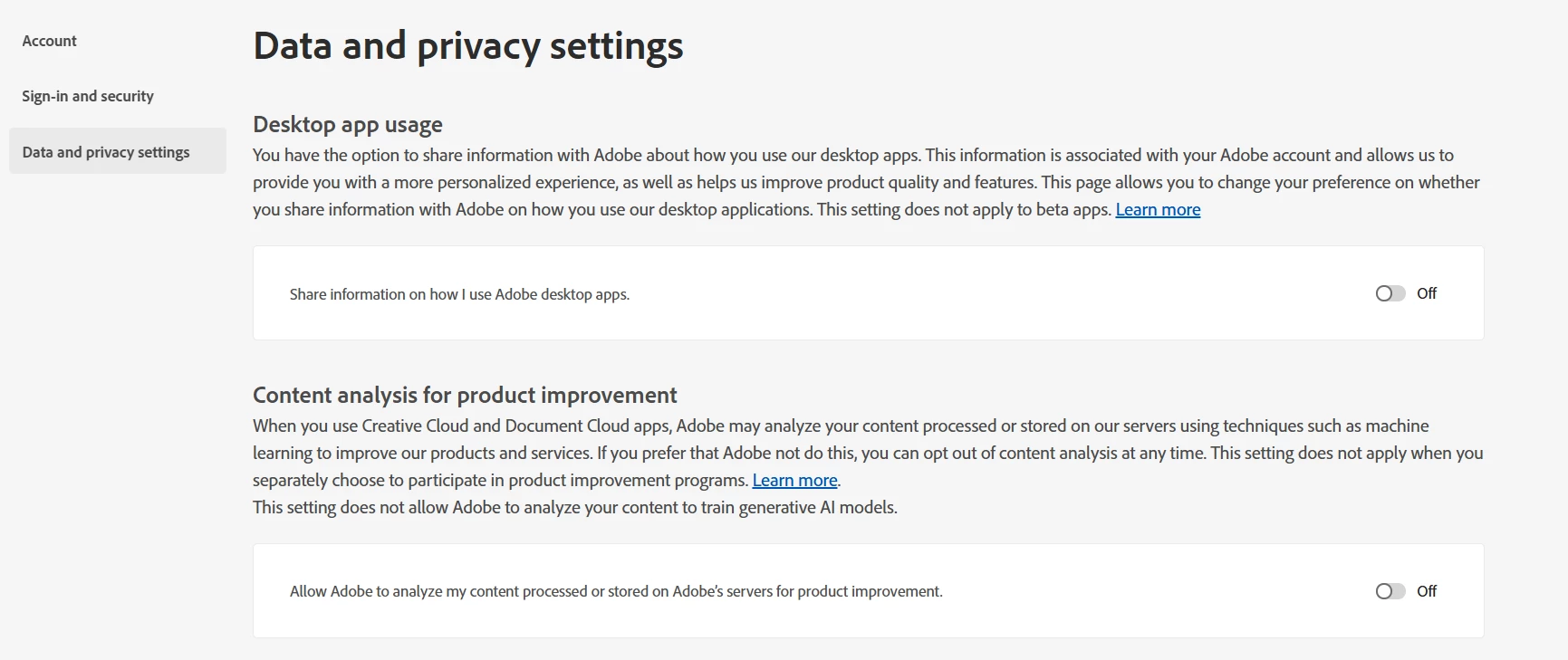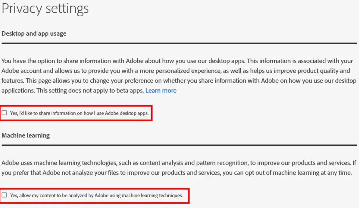 2) In an Adobe app or the Creative Cloud app, you can click on your profile icon and then click on Adobe Account. As of this article, you can also go directly to your Adobe Account Privacy Settings and uncheck! They are not worth your system resources.