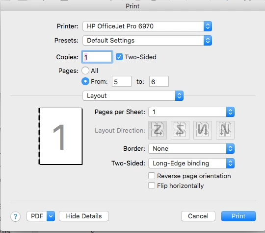 Hi, I can't get duplex printing to use the long edge binding. No matter what I select, it prints on the short edge. I have the portrait layout selected and I am using an HP printer on Mac OS. This only occurs in Adobe Reader, not other apps. How can I get long edge printing?