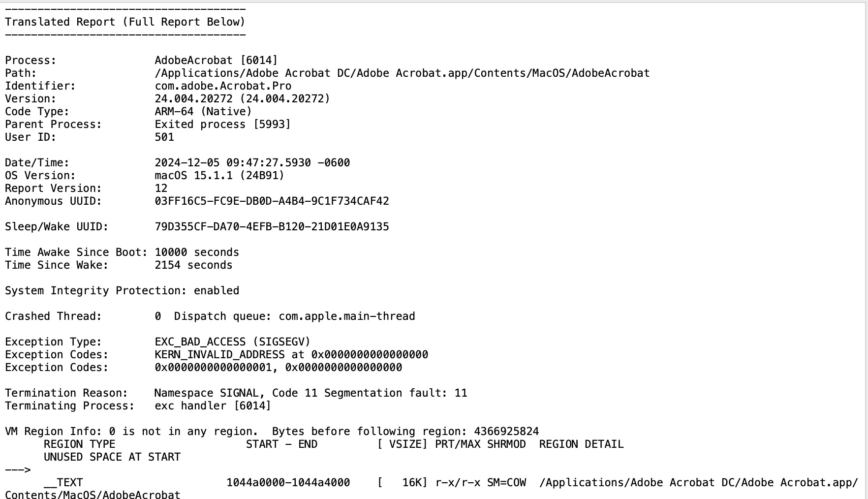 Acrobat Pro is crashing when I Launch on my Mac since the latest update 2024.004.20272. The MacOS is 15.1.1. Acrobat has been uninstalled/reinstalled but still the same issue.