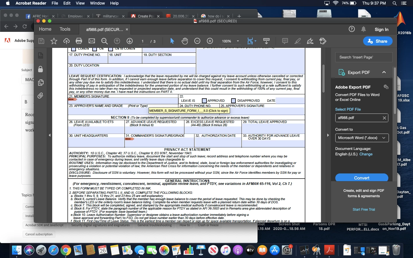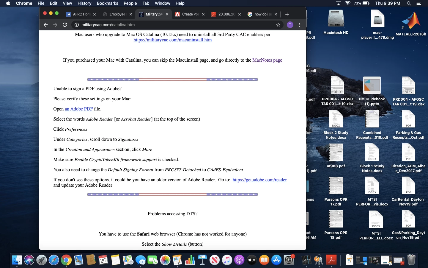 Recently upgraded to MAC OS Catalina. Downloaded an AF pdf from the EPubs. When I click on the signature block nothing happens (image 1, below). Initally, the PDF said I couldn't sign it and that I had to print it, but then I followed the instructions from militarycac.com (image 2, below), which at least got rid of the purple banner stating I had to print my PDF to sign it. In regards to the instructions in image 2, I only really had to make the following change: "You also need to changetheDefault Signing FormatfromPKCS#7-DetachedtoCAdES-Equivalent", everything else was already done. What do I need to do to digitally sign a pdf with a military CAC?