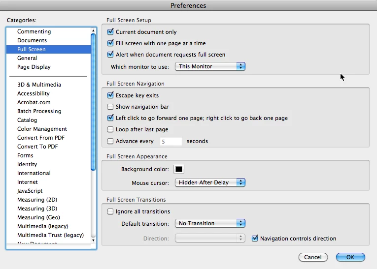 I am making an interactive PDF from InDesign CS5 and would like to have the presentation loop. I have my page transitions set, but I don't see anywhere to set the document to loop. Is there a setting within InDesign/Acrobat that I am missing? Is this possible?