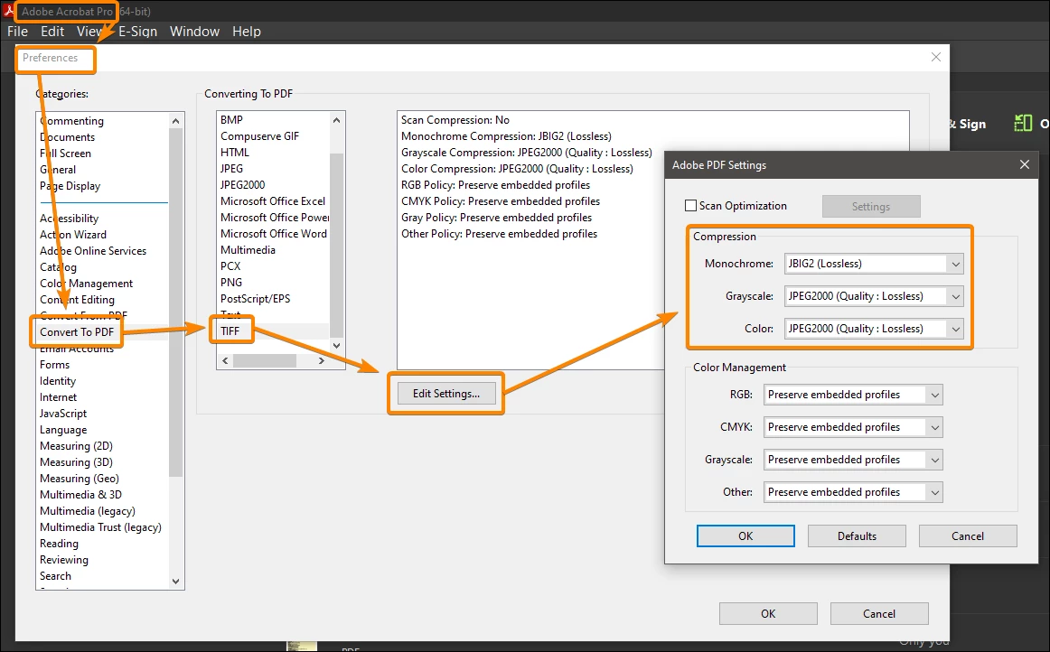 I have some tiff files (some art pages) with the same size and I want to make a PDF file with them. I'm using acrobat XL and I want my pdf to have the exact quality. I know how to do this, but in my test, the final file had a big quality loss. How can I make this work?