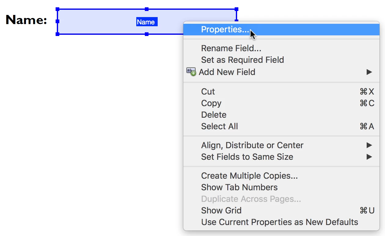 - Right-click on the Text field with the Select tool (Black pointer in the toolbar at the top), and choose Properties...