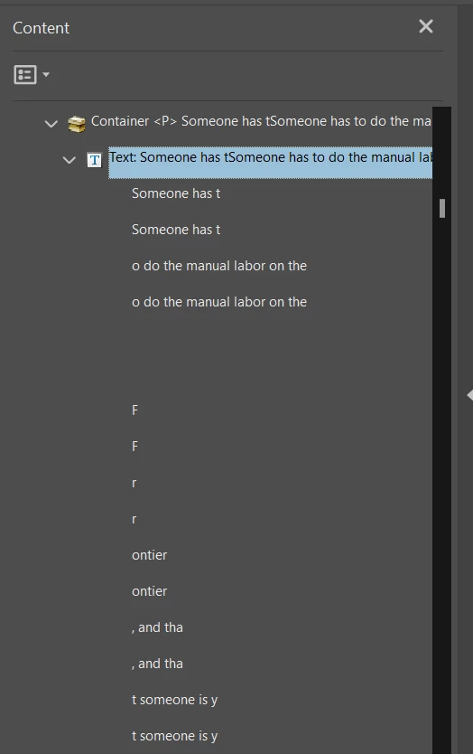 I'm trying to remediate an existing PDF in Acrobat but every time I manually tag text using the Reading Order tool, it comes out garbled and duplicated within the tag. The only solution I can find is to go into the Contents Pane and manually delete the duplicates, but that is time-consuming and prone to error.