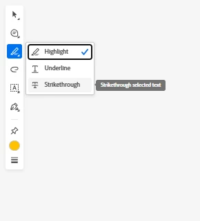 In a pdf that’s been sent out for review (cloud), you previously could select some text, and a quick markup toolbar would pop up. In that toolbar you could select strikethrough. That is no longer available (first image), and I cannot seem to change the settings on the markup toolbar. I now have to select the text, scroll over to the markup toolbar on the side, click and hold on the highlight tool, and then select strikethrough (second image). Is there a way to add the strikethrough option back to the quick toolbar?